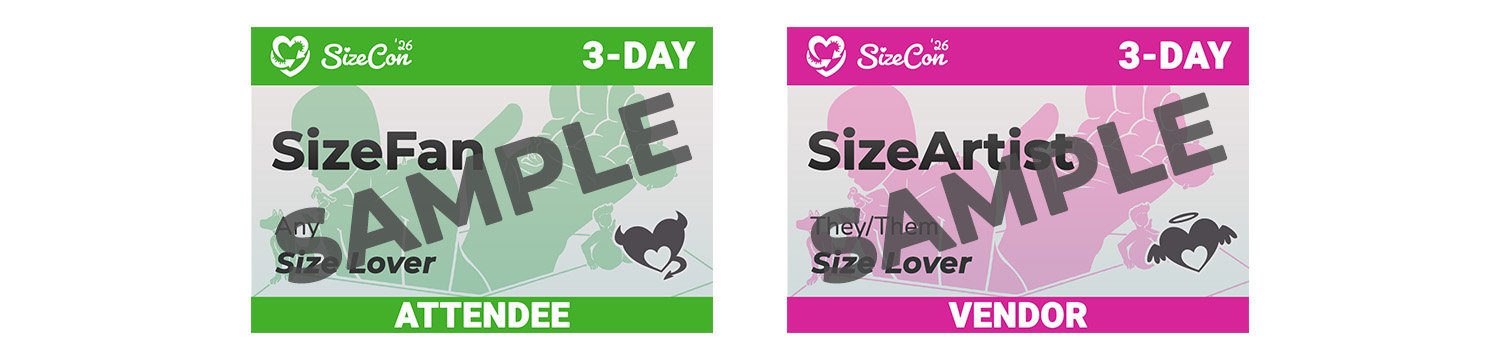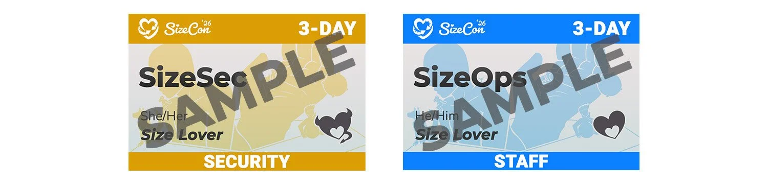 💚 Be respectful of people’s comfortability with adult content! This will be listed on an attendee’s badge. The horned “Naughty” badge implies you’re comfortable discussing adult situations/content in a platonic and respectful manner. The halo’ed “Nice” badge means you’d like to keep size discussions as fluffy and Safe-For-Work as possible. The classic heart badges are for supporters of a Size-fan and may or may not be comfortable discussing adult topics or size related topics. Please ask!